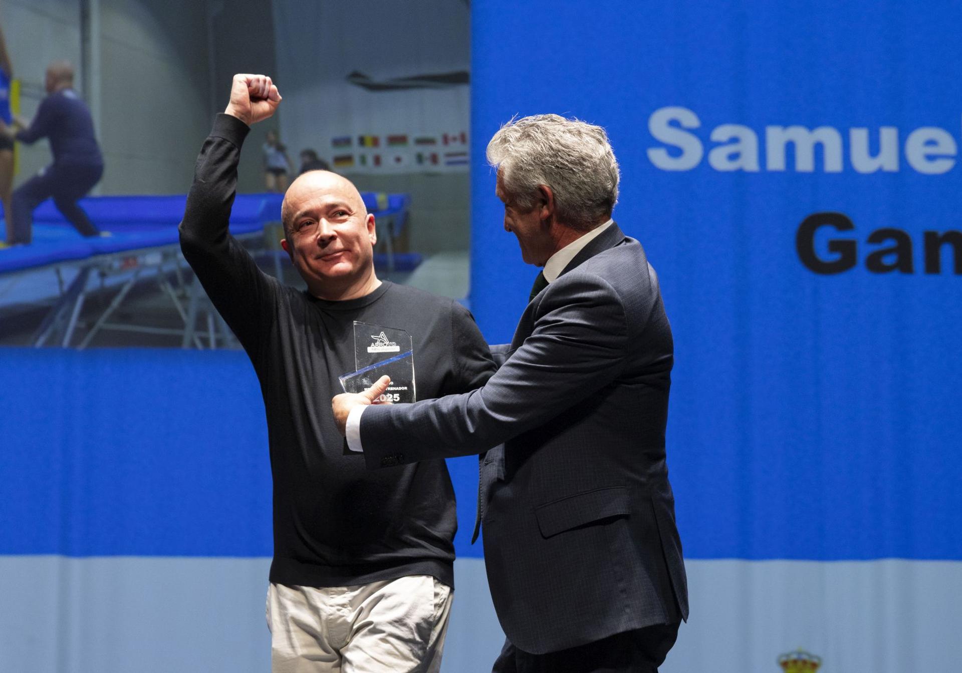 El trofeo Mejor Entrenador 2025 fue para Samuel Castro del club Trampolín Arroyo. Miembro del cuerpo técnico de la Selección Española Absoluta de Trampolín. Fue elegido técnico experto de DMT para impartir un training camp organizado por la UEG (Union Européenne Gymnastique) en Bakú (Azerbaiyán). La pasada temporada participó en el equipo técnico en la World Cup 2025 Baku y Campeonato del Mundo 2025 en Pamplona. Samuel se llevó una gran ovación del público. «Estamos en un buen momento. Tenemos 100 gimnastas en el club y muchos retos por alcanzar. Participar con el equipo nacional en campeonatos del mundo es algo increíble», señaló.