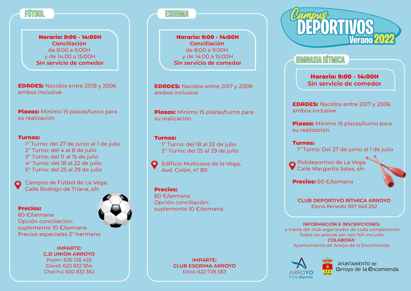 Más información e inscripciones a través de los clubes organizadores de cada campamento: Club Deportivo Rítmica Arroyo, Club Esgrima Arroyo, C.D. Unión Arroyo, Club Baloncesto La Flecha, Club Deportivo Arroyo Futsal y Club Deportivo Gimnasia en Trampolín Arroyo.