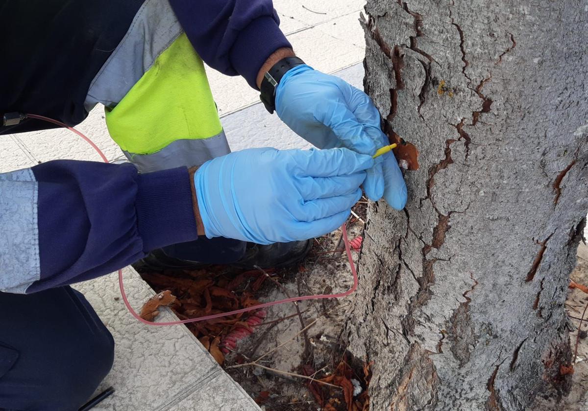 El Ayuntamiento ha actuado en unos 200 árboles de la ribera del río, Sotoverde, cerro del Cotarro de la Horca y el polígono. La medida consiste en la inyección a presión de un biocida en el tronco del árbol que se incorpora a su savia natural y llega a las hojas de las que se alimenta esta oruga