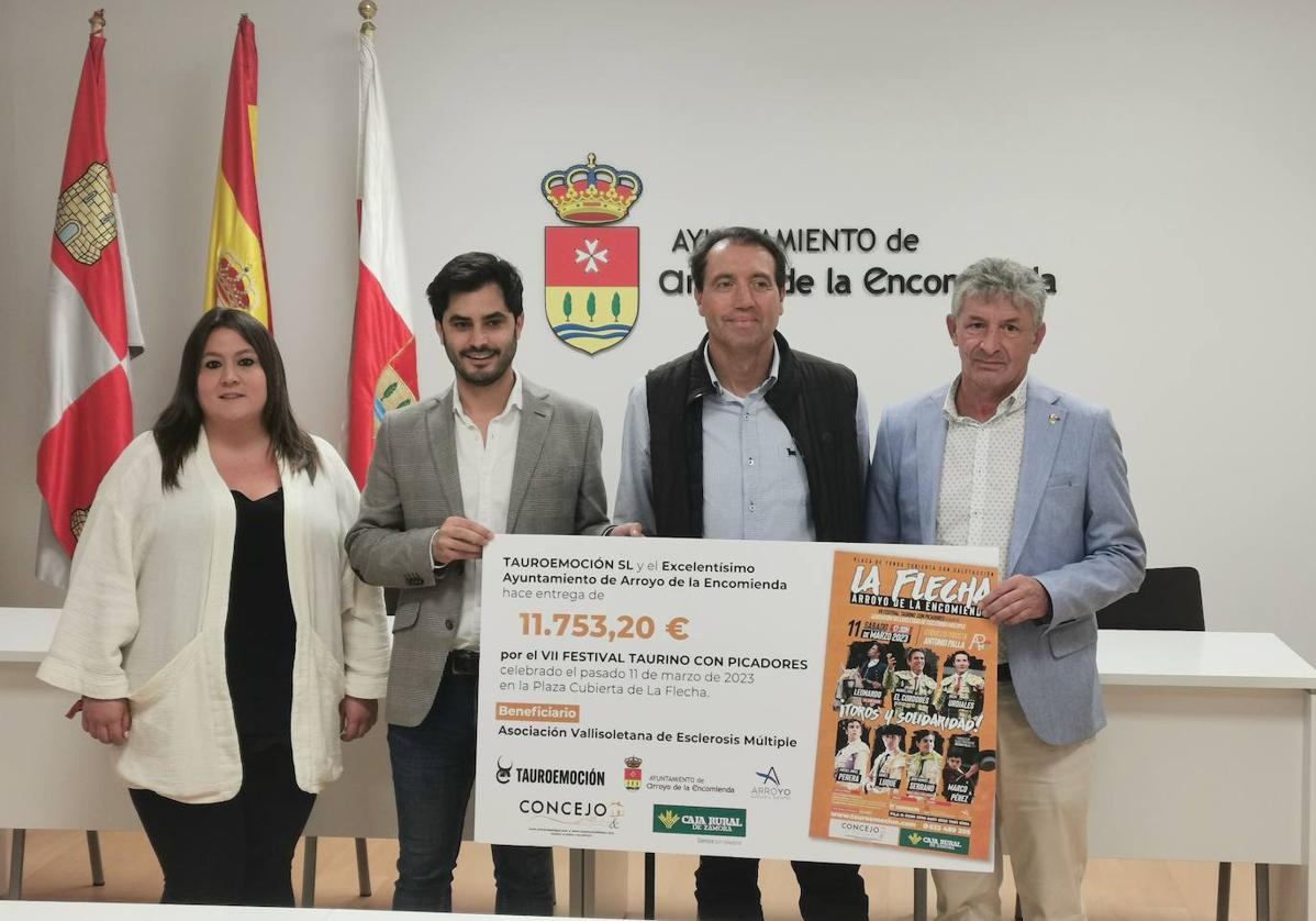 En la mañana del lunes, en el Ayuntamiento de Arroyo de la Encomienda, ha tenido lugar el acto de entrega del cheque con 11.753 ... euros a favor de la Asociación Vallisoletana de Esclerosis Múltiple que fueron recaudados en el VII edición del Festival Taurino celebrado el pasado 11 de marzo en la plaza de toros de La Flecha.