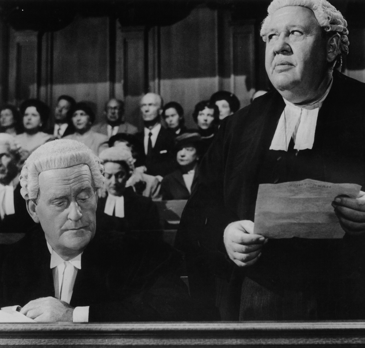 La obra original es, desde luego, un prodigio de “carpintería teatral”, lleno de revelaciones sorprendentes y aturdidoras, ambigüedades morales y ramalazos cómicos, más la añadidura de una intriga que cautiva al más pintado, sobre todo si uno, bajo la pintura de los años, esconde un alma de niño. Pero nada de esto sería posible sin la aportación de un Charles Laughton colosal, descomunal, ¡catedralicio!, que brinda aquí la que tal vez sea la mejor interpretación de su carrera, o siquiera la más característica, dando vida al abogado sir Wilfrid, cascarrabias y socarrón, ampuloso y lenguaraz, fumador impenitente de habanos y bebedor contumaz de brandy a quien la convalecencia de una afección coronaria ha querido convertir en un hombrín vigilado (¡asediado!) por la enfermera miss Plimsoll, celosa censora de sus hábitos, a quien encarna la esposa de Laughton en la vida real, la inolvidable “novia de Frankenstein” Elsa Lanchester.