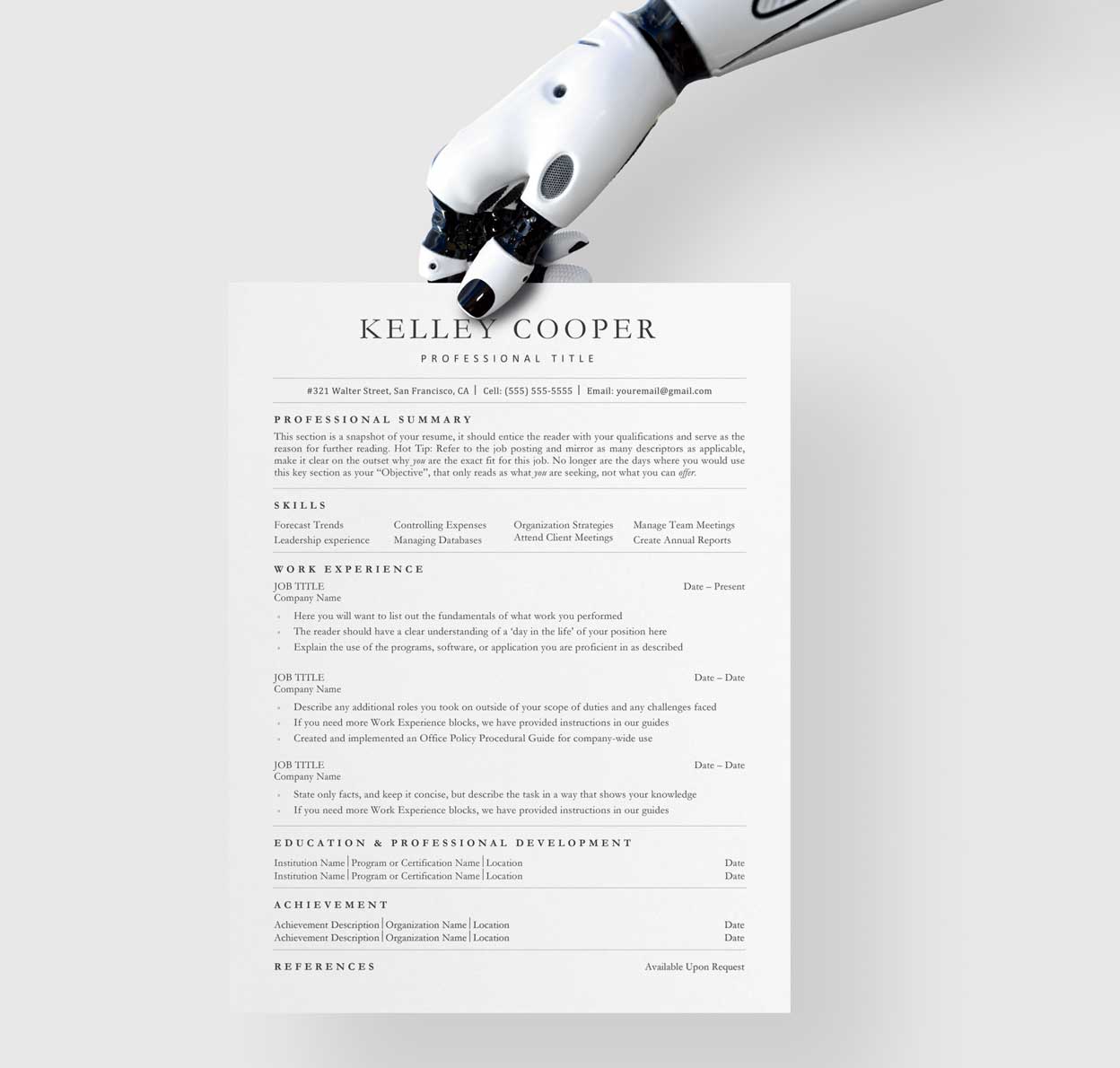 El currículum debe presentar un guion estándar para que la IA lo interprete correctamente: incluye la información de contacto, un pequeño sumario de dos frases, la experiencia laboral, la educación y títulos y —si quieres— otras aptitudes. Hay multitud de plantillas, gratuitas y de pago, de currículums pensadas para la inteligencia artificial. Úsalas.