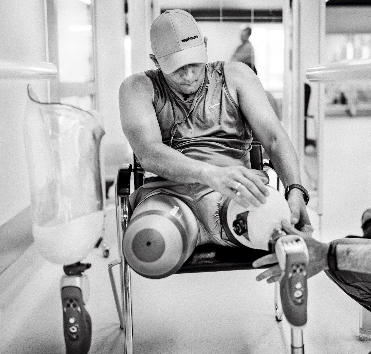 En otra sala del centro, Serhiy Malechko, un hombre de 37 años oriundo de Lviv, espera con la mirada perdida mientras una enfermera lo conecta a su máquina de rehabilitación. Enviado a combatir en la ciudad de Bakhmut, en diciembre de 2022, resultó herido de metralla el 20 de ese mes cuando acudía al rescate de unos camaradas heridos. Sobrevivió a dos amputaciones y a una operación para extraerle metralla alojada a dos centímetros de su corazón. «Quiero recuperarme pronto, ser independiente, ser útil para mi país y ser un ejemplo para mis tres hijos», desea.