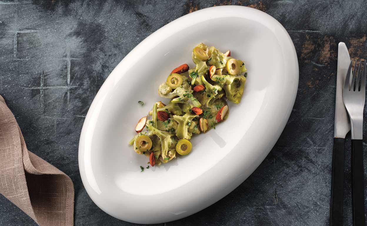 Acabado: aliña las alcachofas escurridas y troceadas con la vinagreta y sírvelas en una fuente de la forma más vistosa. Reparte las almendras tostadas enteras o partidas en dos y remata con un hilo de aceite y la sopera restante de estragón. Riégalo también con lo que quede de vinagreta.