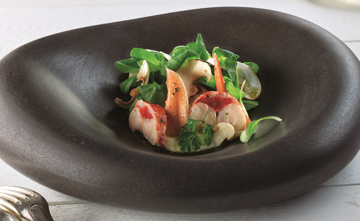4. Se laminan los hongos con una mandolina y se aliñan. En el plato final se coloca una base de crema de hinojo, luego el bogavante troceado, los hongos aliñados, los brotes de canónigos y las hojas de perifollo. Se aliña todo con la vinagreta.