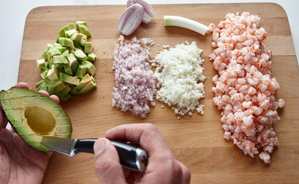 Se rellenan las cáscaras de aguacate con la ensalada bien fría. Se adornan con algunas colas de gambas peladas que habremos dejado enteras, sin picar, y se esparcen por la superficie algunos germinados verdes aliñados con aceite de oliva y sal. ¡Y listo!