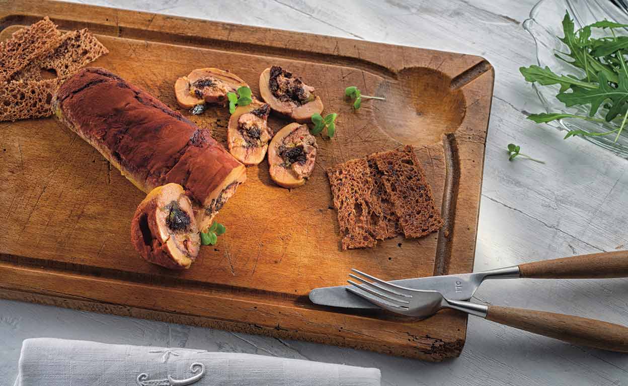 Terrina de hígado de pato, cacao y uvas pasas: