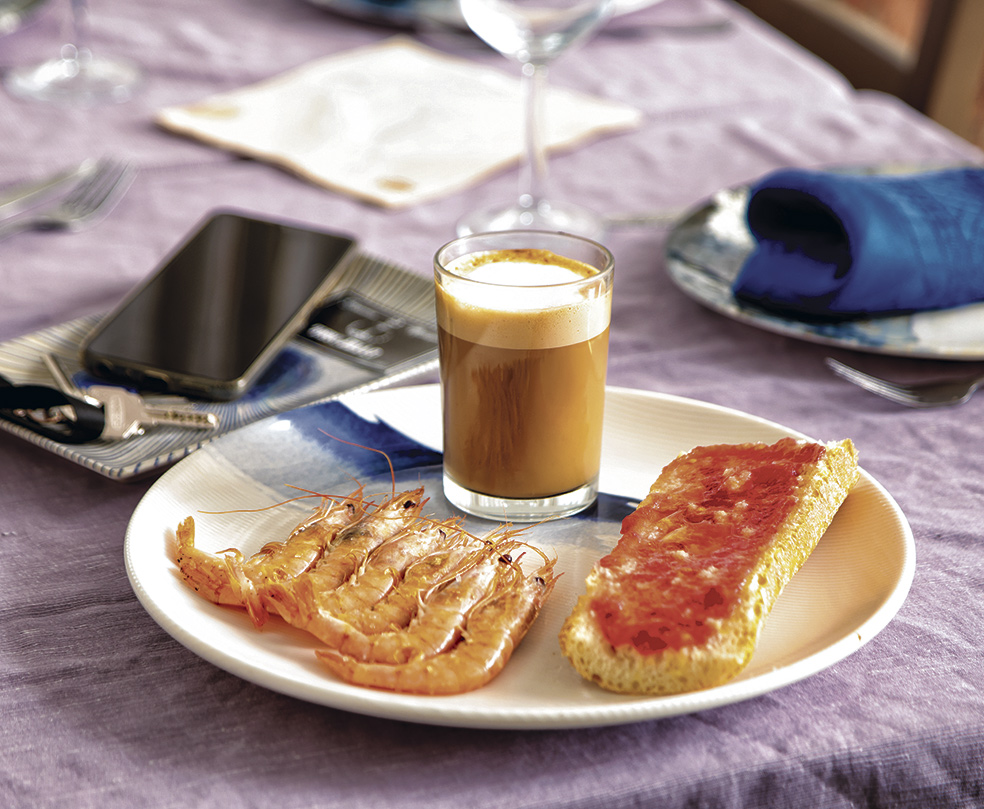 «En Parla: unas gambas a la plancha, pan tumaca y café. En el curro: montado de chorizo y más café. A media mañana, unos torreznos del bar de Monteverde».
