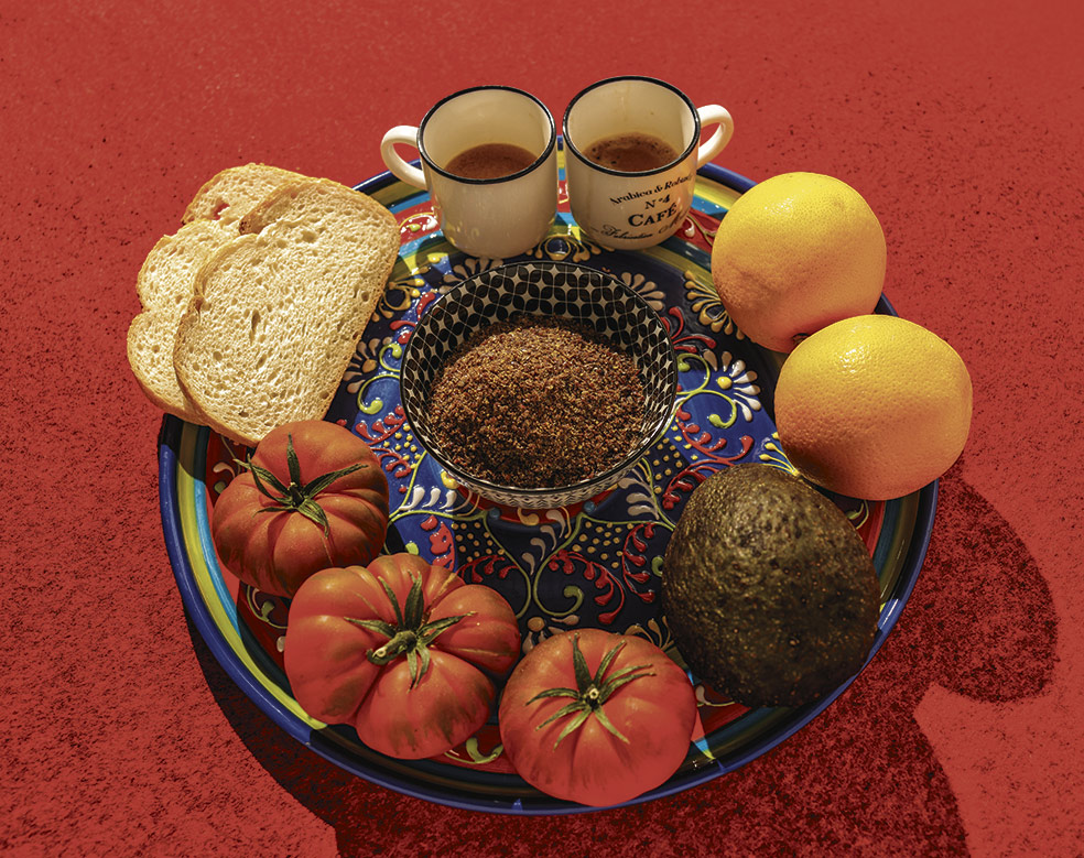 «Dos cafés con leche de soja; un zumo de naranja; una tostada con aguacate y tomate; y un yogur con leche de soja, semillas de chía y lino, canela y miel».